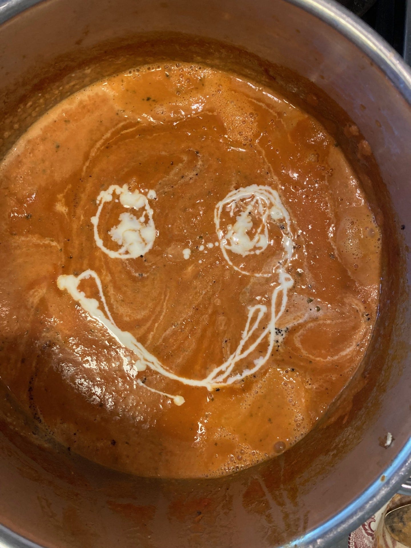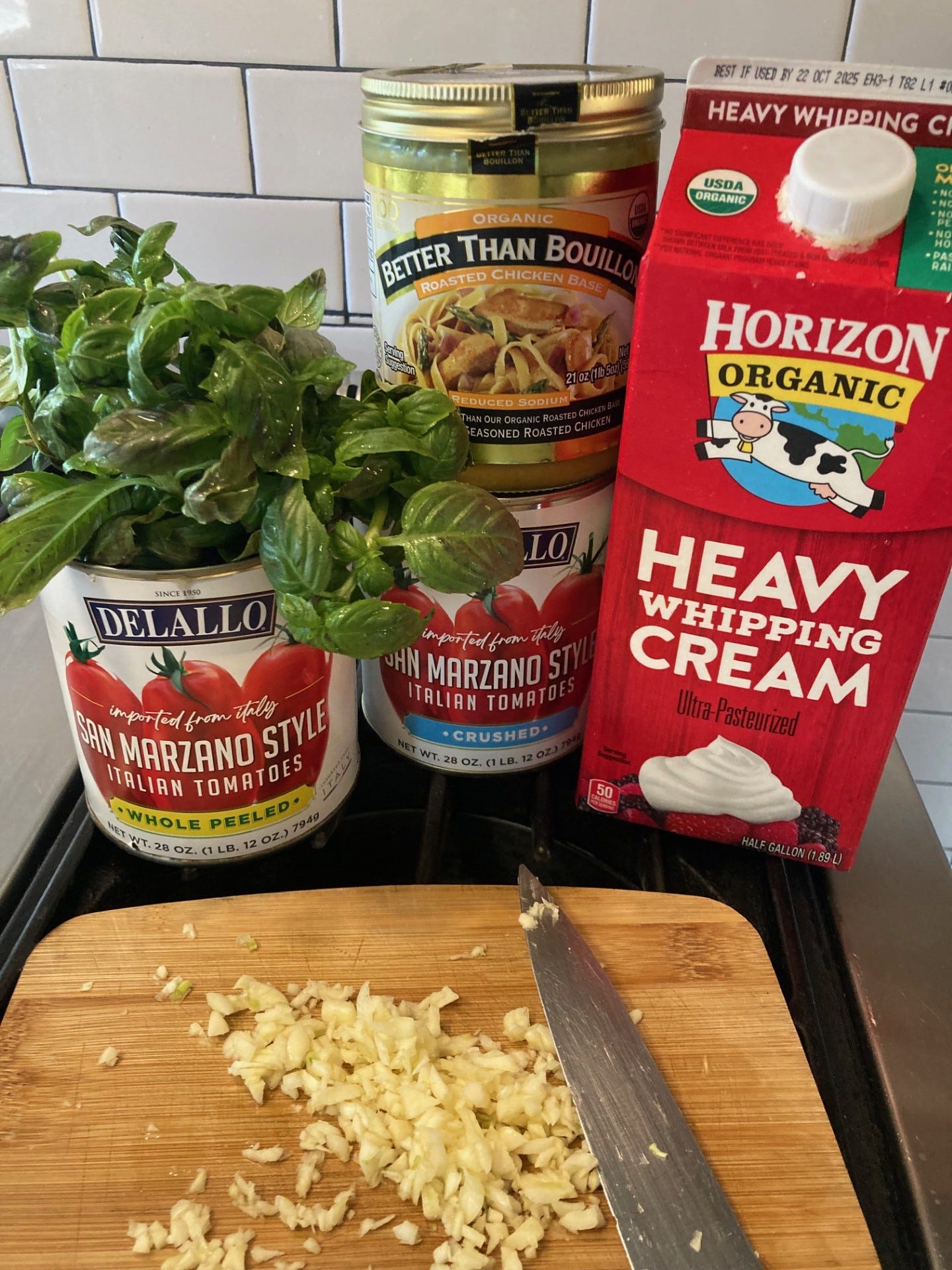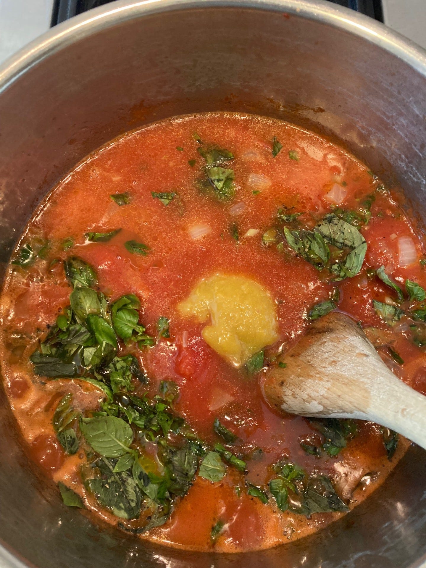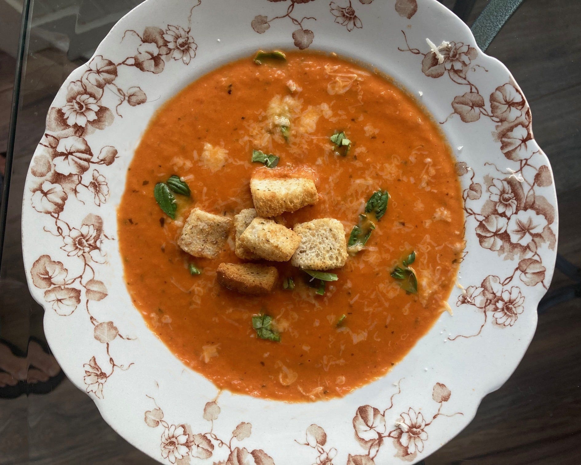 The fresh basil and cream make this soup. As do the San Marzano tomatoes. The chicken stock gives it more flavorful goodness. The parmesan brings another note and the cheese, milk and the bit of sugar cut the acidity.